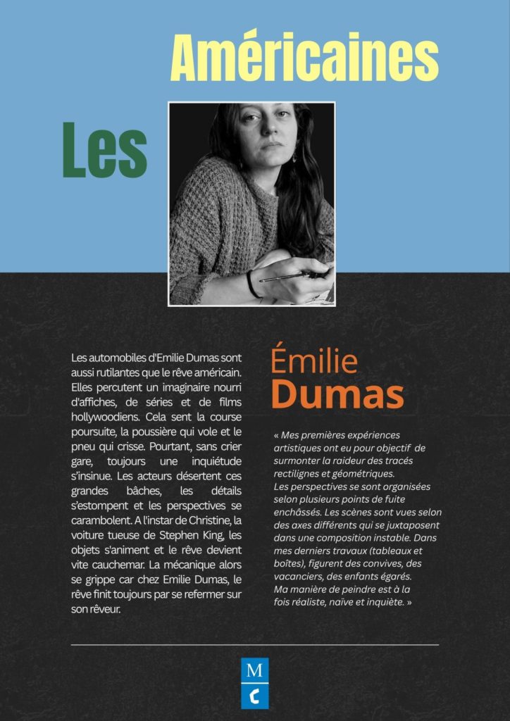 Les belles Américaines, ce sont les voitures mythiques d’une époque désormais révolue, les trente glorieuses, avec lesquelles s’amuse Emilie Dumas. Son esthétique hyperréaliste laisse toujours planer une part de mystère. Œuvre inachevée et perspective tronquée nous racontent un monde d’images et de fantasmes.